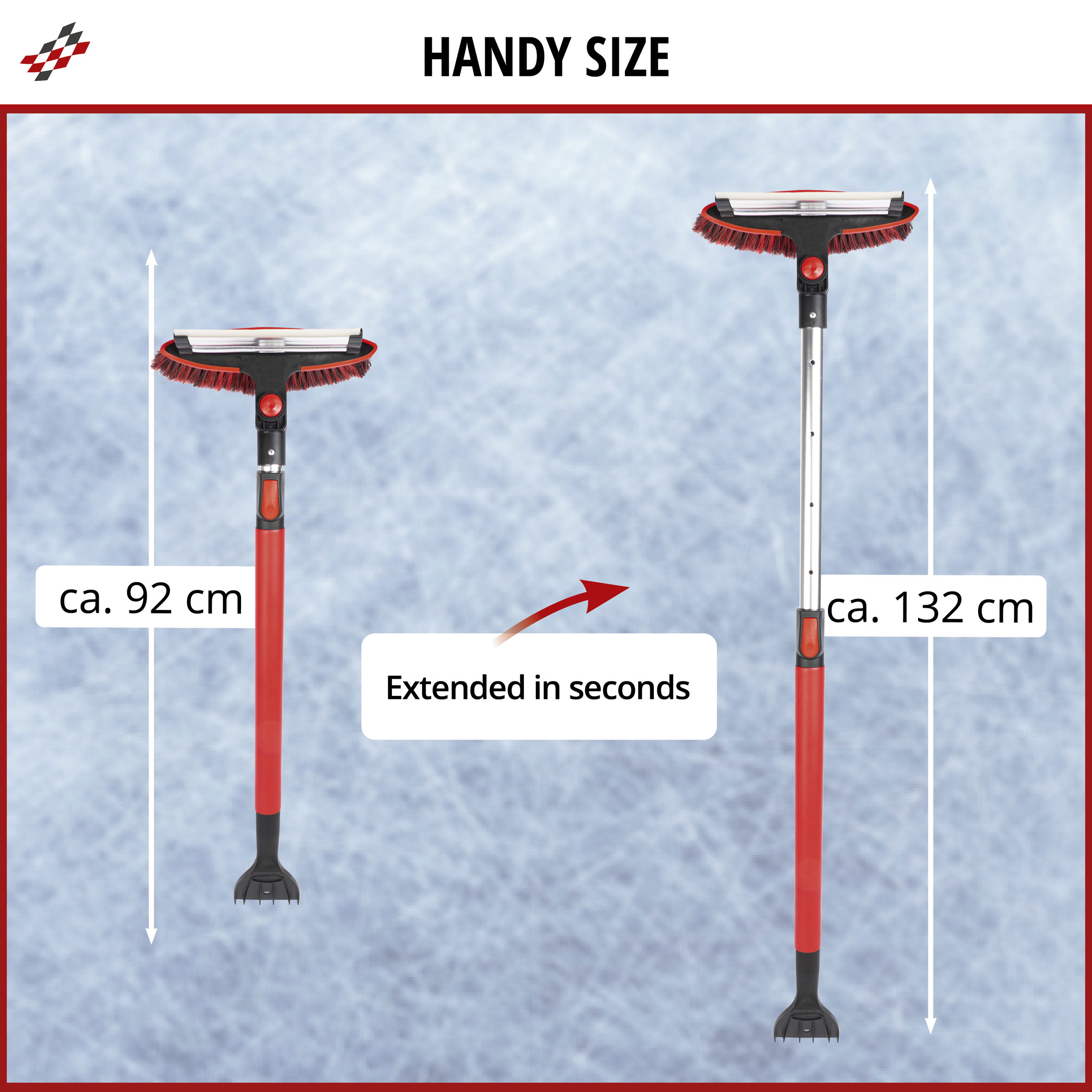 The product is made of high-quality and durable material. On one side, there is an ice scraper with ice-breaking claws that allow ice to be removed quickly. On the other side of the product is a brush with strong bristles of different lengths, which you can use to quickly free your car from fallen powder snow. The brush can be swivelled from one side to another and locks at 90°, 180° and 270° respectively. In addition, the handle is softly padded and telescopic. Depending on the application, the handle can be adjusted to a length between 92 - 132 cm. This means that all windows of the car can be reached without any problems and laborious ice scraping from inaccessible places in the middle of the windscreen is a thing of the past.